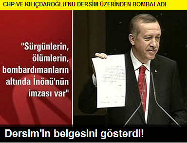 Başbakan Recep Tayyip Erdoğan “Dersim olayları ile ilgili Devlet adına özür dilemek gerekiyorsa ben dilerim” dedi. Erdoğan olaylarda “1936, 1937, 1938 ve 1939’da toplam 13 bin 806 kişinin öldürüldüğünü” gösteren bir belge açıkladı. Başbakan Erdoğan, Dersim’e yapılan müdahalenin bilançosunu içeren 8 Ağustos 1939 tarihli belgeyi gösterdi.