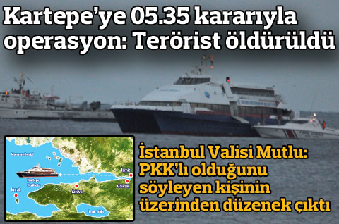 Kartertepe adlı deniz otobüsünü kaçıran terörist düzenlenen operasyonda öldürüldü. Gemi personeli ve yolcuların sağlık durumu iyi. İSTANBUL PKK’lı olduğunu söyleyen bir kişi , dün akşam İzmit-Karamürsel arasında sefer yapan Kocaeli Büyükşehir Belediyesi’ne ait “Kartepe” adlı deniz otobüsünü silah ve bomba tehdidiyle kaçırdı.