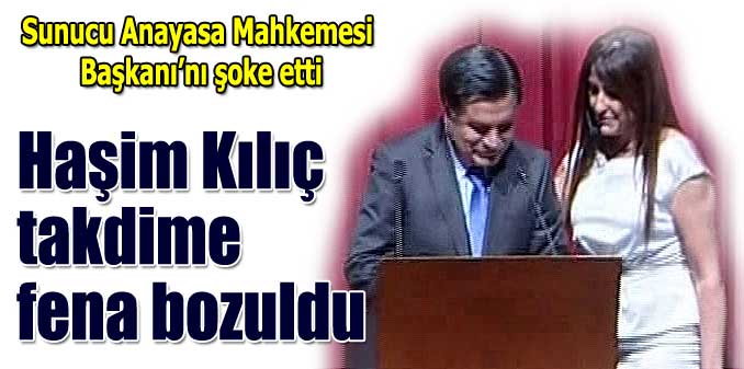 Anayasa Mahkemesi Başkanı Haşim Kılıç’ı konuşmasını yapmak için sahneye davet eden sunucu, Kılıç’ın özgeçmişini okurken “Hukukçu olmadığı halde, Türkiye Cumhuriyeti’nin ilk ekonomi mezunu Anayasa Mahkemesi Başkanıdır” dedi. Kılıç sunucuya yanıt verirken. Kızımıza teşekkür ediyorum. Hukukçu olmadığımı gayet güzel izah etti. O nedenle bu konuyu geçiyorum” dedi.