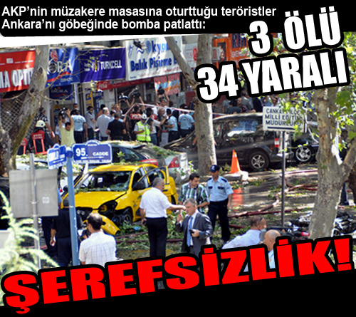 AKP’nin müzakere masasına oturttuğu teröristler Ankara’nın göbeğinde bomba patlattı. 3 ölü 34 yaralı Kana doymuyorlar AKP ile müzakere masasındaki PKK, şehit ettiği Mehmetçiklerin ardından bu kez Ankara’nın merkezi Kızılay’da sivillere saldırdı. Bölücü hainler, Kumrular Sokak’ta bomba yüklü aracı patlatarak kan döktü.