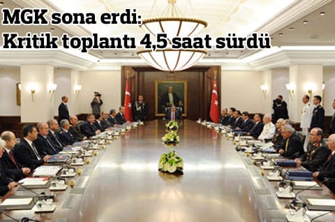 Milli Güvenlik Kurulu (MGK) sona erdi. 4,5 saat süren toplantının ardından yapılan yazılı açıklamada ‘PKK ile daha etkin mücadele yöntemlerine başvurulacak’ denildi. Toplantıya Orgeneral Necdet Özel Genelkurmay Başkanı olarak ilk kez katılırken, Başbakan Yardımcısı Bekir Bozdağ, İçişleri Bakanı İdris Naim Şahin ve Milli Savunma Bakanı İsmet Yılmaz’ın yanı sıra Kara Kuvvetleri Komutanı Orgeneral Hayri Kıvrıkoğlu, Deniz Kuvvetleri Komutanı Oramiral Murat Bilgel, Hava Kuvvetleri Komutanı Korgeneral Mehmet Erten ve Jandarma Genel Komutanı Orgeneral Bekir Kalyoncu da ilk kez kurulda hazır bulundu.