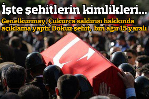 Genelkurmay, Hakkari- Çukurca karayolunda PKK’nın saldırısıyla ilgili açıklama yaptı: 8 asker ve bir korucu şehit oldu, 15 asker ayaralı. Genelkurmay’dan Hakkari’deki saldırı ile ilgili açıklama: hain saldırı sonucu 8 askeri personel ve 1 Geçici Köy Korucusu şehit olmuş, 15 askeri personel yaralanmıştır.