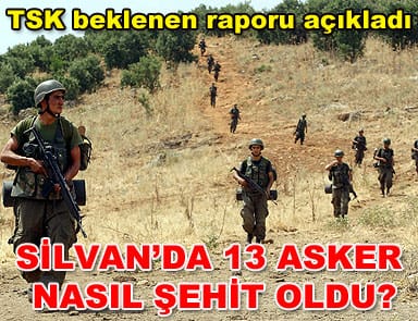 Genelkurmay Başkanlığı, Silvan’da 13 askerin şehit olması olayında uçak kullanılmadığını belirterek, birliğin dönüş hazırlığı yaparken pusuya düşürülmesinin söz konusu olmadığını vurguladı. TSK’nın internet sitesinden yapılan açıklama 14 Temmuz 2011 günü Silvan bölgesinde cereyan eden ve 13 Mehmetçiğin şehit olmasına, 7 Mehmetçiğin yaralanmasına neden olan menfur terör saldırısı ile ilgili olarak Genelkurmay Başkanlığınca yapılan soruşturma sonuçları aşağıdadır. 1. Bölgesinde terörist eylemlerin artış göstermesi üzerine Diyarbakır Valiliği tarafından, Garnizon Komutanlığı olan 7’nci Kolordu Komutanlığından kolluk kuvvetlerini takviye etmesi talep edilmiştir.