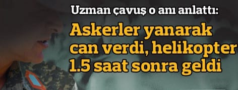 Uzman çavus saldırı anını anlattı: Sabaha dek arama yapınca yorulduk. Mola verdiğimiz an üstümüze bomba yağdı. Çalılar hızla tutuştu, silahlarla ateş açıldı. Alev alan askerler yanmaktan kurtulmak için çırpındı. Yanarak can verenler oldu. İlk helikopter 1 saat sonra geldi İSTANBUL – 13 askerin şehit düştüğü çatışmada bulunan bir uzman çavuş olayın detaylarını Radikal’e anlattı. İsminin yazılmasını istemeyen uzman çavuşun anlattıkları insanın tüylerini ürpertiyor.