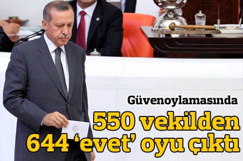 AK Parti Genel Başkanı ve İstanbul Milletvekili Recep Tayyip Erdoğan’ın başkanlığında kurulan 61. Hükümet, 322 oyla TBMM’den güvenoyu aldı. AK Parti Genel Başkanı ve İstanbul Milletvekili Recep Tayyip Erdoğan’ın başkanlığında kurulun 61. Hükümet TBMM’den güvenoyu aldı. TBMM Başkanvekili Sadık Yakut yönetiminde çalışmalarını sürdüren Genel Kurul’da, hükümet için güvenoylaması yapıldı. Toplam 495 milletvekilinin katıldığı oylamada 322 milletvekili evet, 173 milletvekili de hayır oyu verdi.
