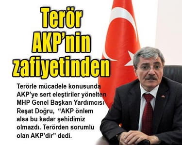 Terörle mücadele konusunda AKP’ye sert eleştiriler yönelten MHP Genel Başkan Yardımcısı Reşat Doğru, “AKP önlem alsa bu kadar şehidimiz olmazdı. Terörden sorumlu olan AKP’dir” dedi.