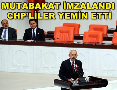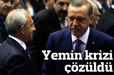 AKP ve CHP kurmaylarının sabah saatlerinden itibaren yaptığı toplantı ile yemin krizi çözüldü. Kurmaylar, hazırlanan metni önce CHP Genel Başkanı Kemal Kılıçdaroğlu ile Başbakan Erdoğan’a sundu. Erdoğan ve Kılıçdaroğlu’nun onayı ile yemin krizinde anlaşma sağlandı. CHP milletvekilleri saat 15.00’de toplanan Meclis Genel Kurulu’nda yemin edecek.