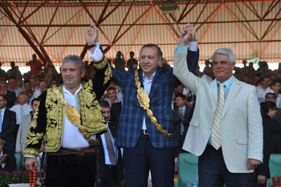 Geleneksel 650. Edirne Tarihi Kırkpınar Güreşleri’ni izlemek üzere Sarayiçi Ermeydanı’na gelen Başbakan Recep Tayyip Erdoğan’a, üst üste üç kez seçim galibiyeti elde ettiği için altın kemer takıldı.