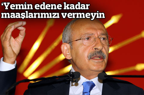 Yemin krizinin çözümü için Meclis Başkanı Cemil Çiçek’le görüşen CHP lideri Kemal Kılıçdaroğlu’nun, yemin edilene kadar milletvekili maaşlarının kendilerine ödenmemesini istediği öğrenildi. ANKARA – Yemin krizinin çözümü konusunda dün TBMM’de önemli bir buluşma gerçekleşti. CHP Genel Başkanı Kemal Kılıçdaroğlu ile Meclis Başkanı Cemil Çiçek biraraya geldi.