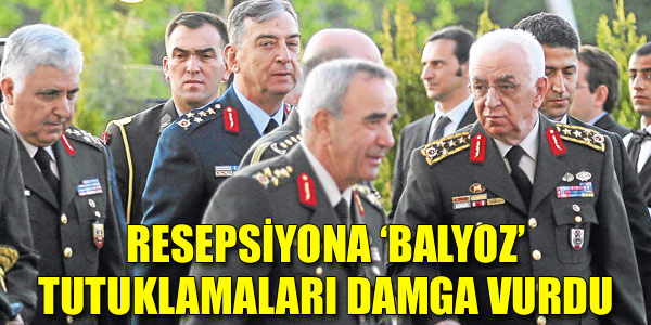 Resepsiyona ‘Balyoz’ tutuklamaları damga vurdu. Harp Akademileri Komutanı Org. Bilgin Balanlı, 1. Hava Kuvvet Komutanı Korgeneral Korcan Pulatsü ve Hava Eğitim Komutanı Korg. Ziya Güler’in Balyoz’da tutuklanmasının ardından gergin günler geçiren Genelkurmay Başkanı Org. Işık Koşaner ve kuvvet komutanları, Azerbaycan Günü Resepsiyonu’nda biraraya geldi. Org. Koşaner, Ağustos’taki şurada görev süresinin 1 yıl uzatılması ihtimaller arasında olan Hava Kuvvetleri Komutanı Org. Hasan Aksay’a yakın ilgi gösterdi. İki komutanın koyu sohbetine tutuklamalar nedeniyle terfide önü açılan Hava Kuvvetleri Kurmay Başkanı Korg. Abidin Ünal’ın da eşlik etmesi dikkat çekti.