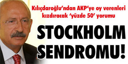 CHP lideri Kemal Kılıçdaroğlu, AK Parti’nin seçimde yüzde 50’ye yakın oy almasını Stockholm Sendromu’na bağladı. Seçimde umduğunu bulamayan CHP’de geçtiğimiz hafta yapılan MYK (Merkez Yürütme Kurulu) toplantısında “Stockholm Sendromu”nun ele alındığı belirtildi.