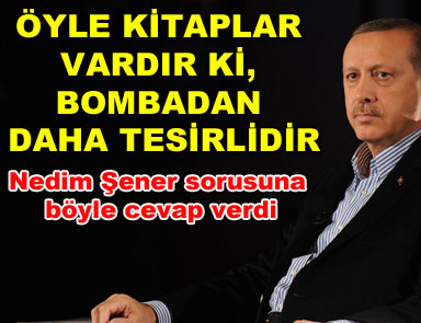 Başbakan Erdoğan, “Sizin kitap-bomba benzetmeniz Nedim Şener’i çok rahatsız etti. Kitap yazmak nasıl terör olur?” sorusuna, “İleride beyefendi ile bir araya gelirsek… Öyle kitaplar vardır ki, bombadan daha tesirlidir” cevabını verdi.