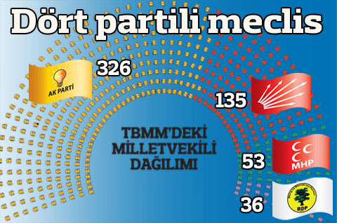 12 Haziran seçim sonuçlarına göre TBMM’de 4 parti grup kuracak. Ak Parti, CHP, MHP ve BDP TBMM’de yer alacak. ANKARA – İki aylık seçim kampanyasının ardından AKP iki seçmenden birinin oyunu alarak yeniden tek başına iktidar oldu. AKP yüzde 49.89 oy oranını aşmasına rağmen 330 milletvekili sayısına ulaşamadı. AKP; Tunceli, Hakkari ve Şırnak’tan hiç milletvekili çıkartamamasına rağmen, Doğu ve Güneydoğu oylarında sadece birkaç puan düşüş yaşadı. BDP, 36 bağımsız milletvekili çıkartırken CHP geçen seçimlere göre oyunu 5 puan yükseltebildi. Kaset tartışmalarıyla baraj altında kalacağını söylenen MHP ise sadece bir puan düşüşle yüzde 13’ü aştı.