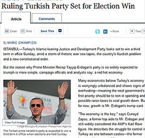 ABD’nin önemli gazetelerinden Wall Street Journal (WSJ), 12 Haziran’da yapılacak seçimleri AK Parti’nin kazanmasının beklendiğini yazdı. Gazetenin internet sitesinde çıkan haberde, Başbakan Recep Tayyip Erdoğan’ın partisinin seçimlerde galip gelecek olmasının nedeninin asıl olarak ekonomi olduğu belirtilerek, ekonomik büyümenin şu anda Başbakan Erdoğan’ın seçimlerdeki “kozu” olduğu vurgulandı.