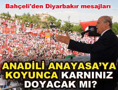 ‘MHP’nin 16 yıl sonra düzenlediği mitingte Bahçeli, önemli mesajlar verdi. ”Türk milletinin hiçbir ferdi bu ülkenin zencisi değildir” diyen Bahçeli, ”Anadili Anayasa’ya koyunca karnınız mı doyacak” diye sordu.