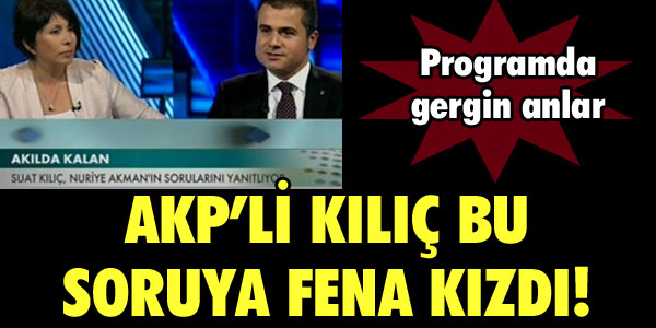 TRT Haber’de yayımlanan Akılda Kalan programına katılan AK Partili Suat Kılıç, çok eşli olan kayınpederi hakkındaki soruya fena kızdı. Gazeteci yazar Nuriye Akman’ın dün akşam Akılda Kalan’daki konuğu Ak Parti Grup Başkan vekili Suat Kılıç’tı. Nuriye Akman, programda “Çok eşlilik yasal olsun” diyerek gündeme gelen aile danışmanı Sibel Üresin’in ve Suat Kılıç’ın kayınpederi Ali Yüksel’in çok eşliliğe bakışı konularına değinince gergin anlar yaşandı.