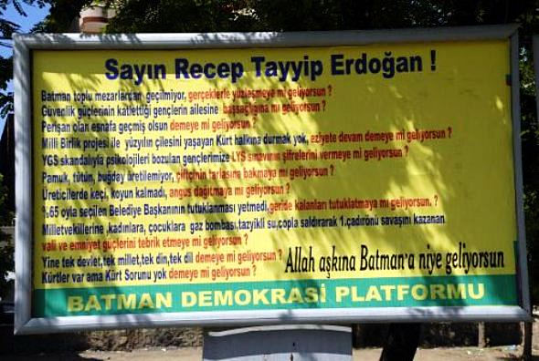 Başbakan Recep Tayyip Erdoğan’ın yarın Batman’da yapacağı miting öncesi Batman Demokrasi Platformu tarafından kentteki billboardlara ilginç afişler asıldı. Afişlerde, Erdoğan’a çeşitli sorular yönetiliyor. (DHA) — Erdoğan’ın yarın Batman’da düzenleyeceği miting öncesi 46 sivil toplum örgütünü bünyesinde barındıran Batman Demokrasi Platformu tarafından billboardlara çeşitli afişler asıldı.