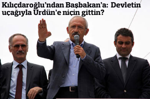 CHP lideri Kemal Kılıçdaroğlu, Trabzon’dan Başbakan Erdoğan’a sordu: “Ben kendisine dedim ki: Hazreti Ömer’in adaletinden söz ediyorsan, Ürdün’e sen düğün davetiyesi götürdün devletin uçağıyla,sen Ürdün’e devletin uçağıyla niçin gittin?” TRABZON-/ERZURUM- Geceyi Giresun’da geçiren Kılıçdaroğlu, karayoluyla geldiği Giresun-Trabzon il sınırında partililerce çiçeklerle karşılandı. Buradan Beşikdüzü ilçe merkezine giden Kılıçdaroğlu, parti otobüsü üzerinden vatandaşlara hitap etti.