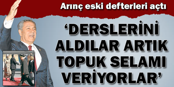 Başbakan Yardımcısı Arınç, Cumhurbaşkanı Gül’e selam vermeyen, eşinin elini sıkmayan askerlerin artık topuk selamı verdiğini söyledi. E-muhtırayı örnek veren Arınç, “28 Nisan sabahı derslerini aldılar” dedi.