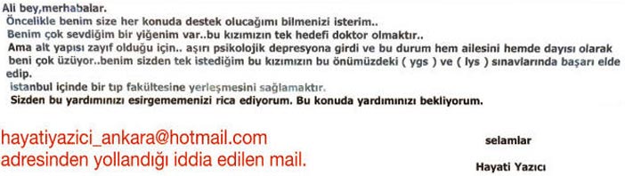 Günlerdir Ankara gündemini meşgul eden ‘bir bakanın ÖSYM’yi arayıp yeğeninin uygun yere yerleştirilmesini istediği’ iddiasının arkasındaki sır perdesi aydınlandı. CHP Lideri Kemal Kılıçdaroğlu’nun isim açıklamadan, “Bir bakan ‘Yeğenimi iyi bir yere yerleştirin’ diye ÖSYM Başkanı Ali Demir’email gönderdi” iddiasının ardından, gündeme damgasını vuran e-postanın ayrıntıları Devlet Bakanı Hayati Yazıcı’nın Özel Kalemi’nden yapılan açıklama ile ortaya çıkmaya başladı.