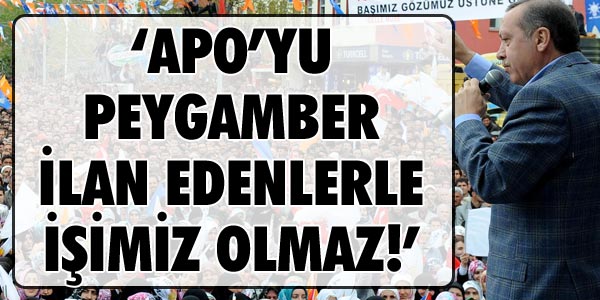 AK Parti Genel Başkanı ve Başbakan Recep Tayyip Erdoğan, “Açık konuşuyorum bakın. Apo’yu peygamber ilan edenlerle bizim işimiz olamaz” dedi.