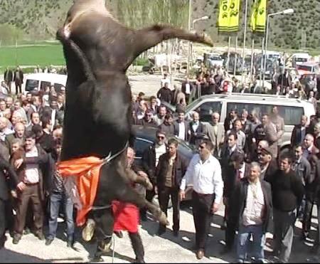 TOKAT’ta AK Parti milletvekili adaylarının hafta sonu kente gelişi sırasında karşılamada boğa kurban edildi. Boynuna AK Parti bayrağı takılan boğa, kamyonetin üzerinden vinçle ayağından kaldırılarak yere indirildi. Bu durumu gören AK Parti Milletvekili ve yeni dönem adayı Şükrü Ayalan, alanı terk etti.