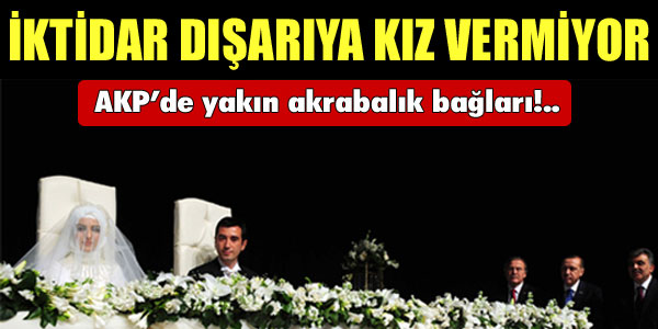 AKP’li bakan ve milletvekillerinin kendi aralarındaki aile ilişkilerinin yanı sıra, birçok bürokratla milletvekilleri arasında da yakın akrabalık bağları bulunuyor. ANKARA- İktidar partisi dışarıya kız vermedi ve Enerji Bakanı Taner Yıldız ile Çalışma Bakanı Ömer Dinçer dünür oldu. AKP’de daha önce de eski Enerji Bakanı Hilmi Güler ile eski Çevre ve Orman Bakanı Osman Pepe dünür olmuştu. Güler’in kızı Şeyma ile Pepe’nin oğlu İsmail hayatlarını birleştirmişti.