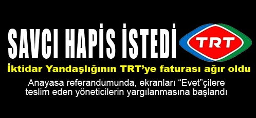 İktidar yandaşlığının TRT’ye faturası ağır oldu Anayasa referandumunda, ekranları “Evet”çilere teslim eden yöneticilerin yargılanmasına başlandı. Görevi kötüye kullandılar TRT1 Koordinatörü Bülent Ata, TRT Haber Koordinatörü Ali Ahmet Böken ve TRT 6 Koordinatörü Fethullah Kırşan’ın “halk oylaması sürecindeki yayınlarda görevlerini kötüye kullandıkları” gerekçesiyle 6’şar aydan 2’şer yıla kadar hapis cezasına çarptırılması istendi.