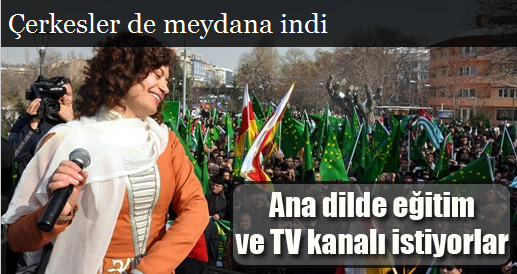 Çerkesler ilk kez meydanlara indi. At üzerinde gösteri yapıp, ana dilde eğitim ve TV kanalı istediler. ANKARA- Çerkes Hakları İnisiyatifi tarafından düzenlenen mitingde göstericiler Ankara sokaklarında at üzerinde yürüyüş yaptı. İlk defa alanlara inen Çerkesler, “Türkiye’de Kürtlerden sonra en kalabalık etnik nüfus bizde. Başbakan Erdoğan’dan Çerkes kimliğini tanıyoruz açıklaması bekliyoruz” dediler.