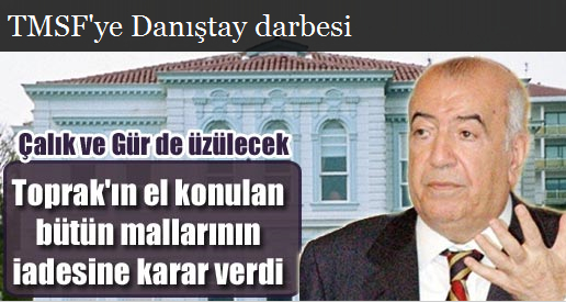 Danıştay 13. Ceza Dairesi, Halis Toprak’ın tüm malvarlığını satışa çıkaran TMSF’ye ‘dur’ dedi! Yüksek mahkemenin bu yürütmeyi durdurma kararı, en çok Ahmet Çalık ve Remzi Gür’ü üzecek. Neden mi? Danıştay 13. Dairesi, Tasarruf Mevduatı Sigorta Fonu’nun (TMSF) Toprak Grubu’nun Aslanlı Köşk ve Toprak Center dahil taşınmazlarını satılmasına ilişkin yürütmeyi durdurdu.