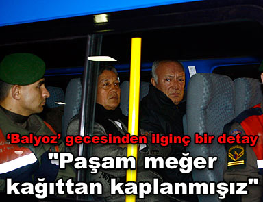 Balyoz davasının son duruşmasında 163 sanık hakkında çıkan tutuklama kararının şoku sürerken o gece yaşananlarla ilgili ilginç detaylar da bir bir ortaya çıkıyor. Emekli Orgeneral İbrahim Fırtına ile emekli Oramiral Özden Örnek, cezaevindeki koğuşlarına sevki sırasında koridorda yürürken bir tuğgeneral ‘Paşam’ diye bağırdı: Meğer bizler kağıttan kaplanmışız. Komutanlar da başlarını sallayarak koğuşlarına gitti.