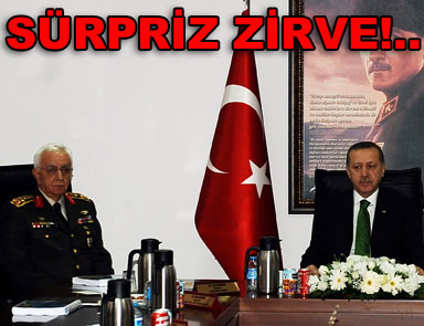 “Balyoz Davası”nda aralarında kuvvet komutanlarının da bulunduğu 163 sanık için tutuklama kararı verilmesinin ardından Başbakan Recep Tayyip Erdoğan ve Genelkurmay Başkanı Orgeneral Işık Koşaner sürpriz bir şekilde Dolmabahçe’de bir araya geldi.