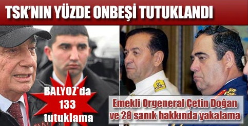 ‘Balyoz Planı’ davasında, emekli orgeneraller Fırtına, Örnek ve Alan’ın da aralarında bulunduğu 134 sanığın tutuklanmasına, 29 sanık hakkında da yakalama kararı çıkarılmasına karar verdi. Eski 1’inci Ordu Komutanı emekli Orgeneral Çetin Doğan hakkında ise yakalama kararı çıkarıldı. Kararın açıklamasının ardından salonda bulunan sanıklar da hep bir ağızdan Harbiye Marşını okudular.