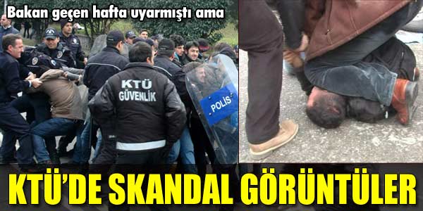 Geçtiğimiz pazartesi günü İl Emniyet Müdürleri Değerlendirme Toplantısı’nda konuşan İçişleri Bakanı Beşir Atalay, Çevik Kuvvet’in toplumsal olaylarda tutumunun polisin imajında belirleyici olduğunu belirterek, oralara genç polislerin gittiğini ve bu nedenle eğitimin önem taşıdığını söylemişti İçişleri Bakanı Atalay’ın bu uyarısına rağmen polis bugün KTÜ’de Çevre Bakanı Veysel Eroğlu’nu protesto etmek isteyen gruba yine çok sert bir şekilde müdahale etti. Biber gazı ve coplarla öğrenci grubunu dağıtan polis göstericileri yerlerde sürükleyerek gözaltına aldı.