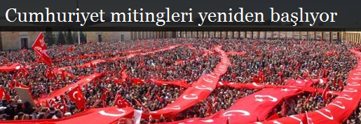 Cumhuriyet mitingleri, yeniden başlıyor. Mitingler hava şartları düzelene kadar kapalı salonlarda ve “Türkiye bizim, Cumhuriyet Bizim” sloganıyla yapılacak. ANKARA- Ergenekon iddianamelerinde de geçen “Cumhuriyet mitingleri” yeniden, ama bu kez salon toplantısıyla başlıyor. İlki, 14-15 Nisan 2007 tarihlerinde Ankara’da düzenlenen Cumhuriyet Mitingleri, yıllar sonra yeniden start alacak.