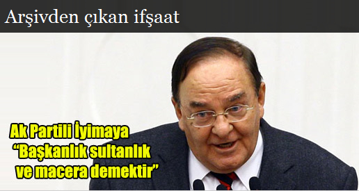 ’’Başkanlık sitemi denemesi bilinmezliklerle dolu maceralı bir yolculuk, sultanlıktır’’ dedi. Bu görüşlerini DYP milletvekiliyken 12 yıl önce Meclis tutanaklarına geçiren İyimaya şimdi ise konuşmuyor…