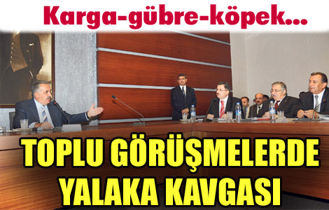 Memurlar ile hükümetin ilk buluşması gergin başladı. Toplu görüşme masasında sendikalar önce bakanla, sonra birbirleriyle kapıştı. Memur-Sen temsilcisi, “Sokmayın kargayı gül olan bağa, gübre müptelası bülbüllenmesin” deyince Kamu-Sen, “Bize karga diyorlar” diyerek ayaklandı. Kamu-Sen’liler Şair Nef’i’nin “Tahir Bey bana kelp dedi…” dizelerini gönderince tartışma büyüdü. Ara verilmesi de gerilimi azaltmadı, Memur-Sen temsilcileri Kamu-Sen heyetine ’Yalaka’ diye bağırdı ve yumruklar devreye girdi. Yaklaşık 2.5 milyon memurun 2010 yılı maaş zamları ile sosyal haklarını belirleyecek toplu görüşmelerin ilk günü gerilimle başladı, tartışmayla sürdü, kavgayla bitti… Toplu görüşmenin ilk saatlerinde canlı yayında Devlet Bakanı Hayati Yazıcı’yla tartışan konfederasyon heyetleri, gerilim artıp saatler ilerledikçe birbirleriyle kavga ettiler. Toplu görüşme, masada bugüne kadar hiç yaşanmamış bir “karga-gübre-köpek…” tartışması ve ardından gelen “yalaka” hakaretleri arasında sona erdi. Toplantının sonunda Bakan Yazıcı’nın bitkin düştüğü, şaşkınlığını gizleyemeyerek, çevresindekilere “Bu yıl ne oluyor, nedir bu olup bitenler?” demekten kendini alamadığı belirtildi.