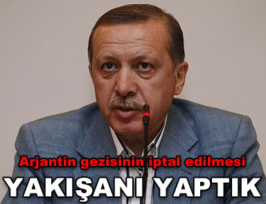 Başbakan Recep Tayyip Erdoğan, Arjantin gezisinin iptal edilmesiyle ilgili, “Türkiye’nin onuruna yakışan, yaraşan neyse bunu yapmak durumundaydık. Ve bunu yaptığımıza inanıyoruz” dedi. Başbakan Erdoğan, Güney Amerika gezisine katılan iş adamlarıyla Hyatt Oteli’nde bir araya geldi.
