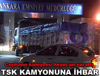Ankara’da durdurulan sivil bir kamyonda çok sayıda silah ve patlayıcı bulundu. Kamyonun başka bir ilden Gölbaşı’ndaki bir askeri birliğe cephane sevkiyatı yaptığı öğrenildi. Ankara’da Etimesgut civarında bir ihbar üzerine durdurulan silah ve mühimmat yüklü olduğu belirtilen kamyon Ankara Emniyet Müdürlüğü’ne getirildi.