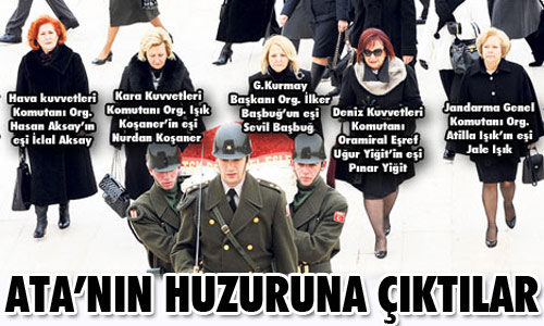 Dünya Kadınlar Günü nedeniyle, komutanların eşleri Ata’nın huzuruna çıktı. ‘Çocuklarımıza babalık yaptık’ G.Kurmay Başkanı Orgeneral İlker Başbuğ’un eşi Sevil Başbuğ başkanlığında bir araya gelen general, amiral, subay, astsubay ve uzman erbaş eşleri ile bayan sivil memurlardan oluşan heyet, Anıtkabir’i ziyaret etti.