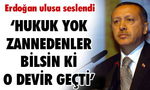 ‘Hukuk yok zannedenler bilsin ki o devir geçti..’ Başbakan Recep Tayyip Erdoğan, karanlık düşüncelerin, doymak bilmez ihtirasların, çağdışı zihniyetlerin bu ülkenin çocuklarının geleceğini karartmasına asla izin verilmeyeceğini belirterek, “Bugüne kadar bu ülkenin medeniyet aşkını köreltenlere, gelişme hızını kesenlere meydanı boş bırakmayacağız. Kim bu ülkede hukuk yok zannediyorsa, kim istediği gibi davranabileceğini, kanunsuz girişimlerini çeşitli kılıflara büründürerek meşrulaştırabileceğini zannediyorsa bilsin ki artık o devirler geçti” dedi.