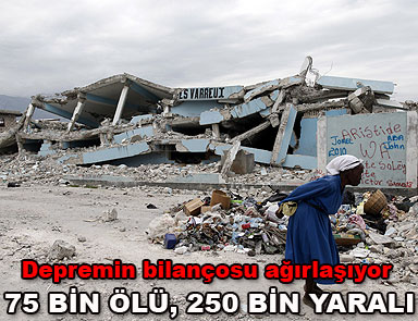 Haiti’de 12 Ocak’ta meydana gelen depremde 75 bin kişinin öldüğü, 250 bin kişinin yaralandığı açıklandı. Sivil Savunma Dairesi, 7 büyüklüğündeki depremde 1 milyon kişinin de evsiz kaldığını bildirdi. Sivil Savunma Dairesi tarafından bu akşam yapılan yazılı açıklamada, felaketzedeler için barınak, gıda, su ve ilaç bulunamadığı belirtildi.