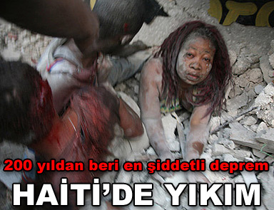 Karayipler’in yoksul ülkesi Haiti’de 7 büyüklüğünde bir deprem meydana geldi. Başkent Por-Au-Prince’teki birçok bina kullanılamaz hale geldi; enkaz altında binlerce kişinin olabileceği belirtiliyor. Yıkıntıların altında kalanların yardım çığlıkları duyuluyor. Amerikan Jeoloji Kurumu (USGS), depremin merkezinin ülkenin başkenti Port-Au-Prince’in 22 kilometre batısında ve sadece 30 kilometre derinlikte olduğunu bildirdi.