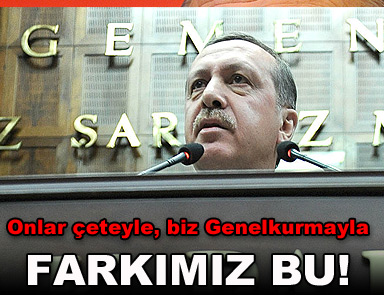 Başbakan Recep Tayyip Erdoğan, Genelkurmay Başkanı ile yaptıkları görüşmeleri eleştiren muhalefete sert çıktı ve “Onlar çeteyle, mafyayla avukatları vasıtasıyla görüşüyor, biz Genelkurmayımızla. Farkımız bu” dedi.
