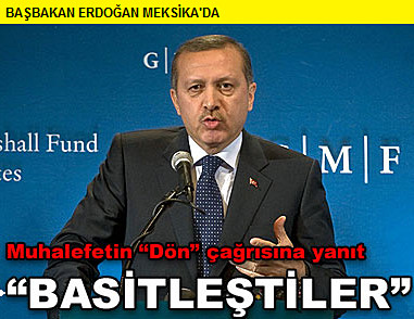 ABD’deki temaslarını tamamlayan Başbakan Recep Tayyip Erdoğan Meksika’ya hareket etmeden önce muhalefetin “Geziyi yarıda kesip Türkiye’ye dön” çağrısına cevap verdi. Erdoğan, “Bu konu konu mu, Bu hitap hitap mı? Bu kadar basitleşti bunlar” dedi. Erdoğan, Marshall Fonu’ndaki konuşmasında da Türkiye gündemine ilişkin açıklamalar yaptı.