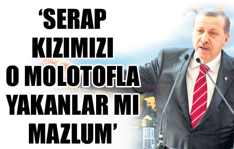 ‘Serap kızımızı yakanlara çocuk deyip geçecek miyiz’ Erdoğan, “Bu süreci tamamına erdireceğiz” diyerek açılımın durmayacağını bir kez daha duyurdu. Başbakan günlerdir süren sokak eylemlerine tepkisini ise şöyle dile getirdi: Serap yavrumuzu otobüste molotof kokteyliyle yakanlar kim? O çocukları mazlum mu göstereceksin?
