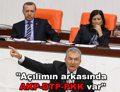 CHP Genel Başkanı Deniz Baykal, “Bu açılım politikasının arkasında AKP, DTP ve PKK’nın işbirliği vardır” dedi. Burdur’un Karamanlı İlçesinde belediyeyi ziyaret eden CHP Genel Başkanı Deniz Baykal, hükümetin etnik ayrışmanın dümesine bastığını söyledi. Burdur’un Karamanlı Belediyesini ziyaret eden CHP Genel Başkanı Deniz Baykal, gazetecilere yaptığı açıklamada, Dünya’nın hiçbir yerinde demokrasinin etnik ayrıştırma yapmadığını söyledi.