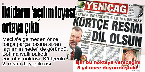 Meclis’e gelmeden önce parça parça basına sızan ‘açılım’ın hedefi de göründü. Bol makyajlı paketin can alıcı noktası, Kürtçenin 2. resmi dil yapılması. AKP, AB’nin bir dayatmasına daha boyun eğdi ve Kürtçe’yi 2. resmi dil yapacak adımları ‘açılım’ın içine yerleştirdi. 10 Kasım’da Meclis’te yapılacak görüşme öncesi netleşmeye başlayan ayrıntıların içeriği sinsi planı ele veriyor: