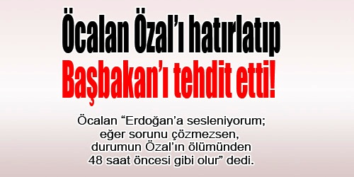 İMRALI canisinin avukatlarıyla yaptığı haftalık görüşmenin notları, örgüte yakınlığıyla bilinen Fırat Haber Ajansı’nda yayımlandı. Öcalan “Erdoğan’a sesleniyorum; eğer sorunu çözmezsen, durumun Özal’ın ölümünden 48 saat öncesi gibi olur” dedi. ERDOĞAN’a cesur olmasını öneren Öcalan, şöyle devam etti: Özal, Kürt sorununun çözümünde ABD’nin verdiği rolü yerine getiremeyince tasfiye edildi. AKP’nin durumu da buna benziyor. Bu kış sürecinde barış gelişmezse baharda çatışmalar artar!