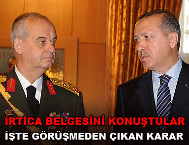 Başbakan Recep Tayyip Erdoğan ile Genelkurmay Başkanı Orgeneral İlker Başbuğ, haftalık olağan görüşmesini gerçekleştirdi. Görüşmede İrtica Mücadele Eylem Planı da gündeme geldi. Saat 18.20’de Başbakanlık Resmi Konut’ta gerçekleşen görüşme 1 saat 20 dakika sürdü.